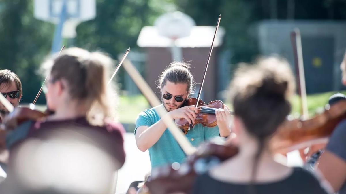 Når de kommer til din skole, ønsker de helst å spille ute i skolegården, hvis været tillater det. Uten en eneste mikrofon eller høyttaler vil dere oppleve hvor mye trøkk det kan være i et klassisk ensemble.